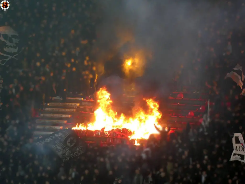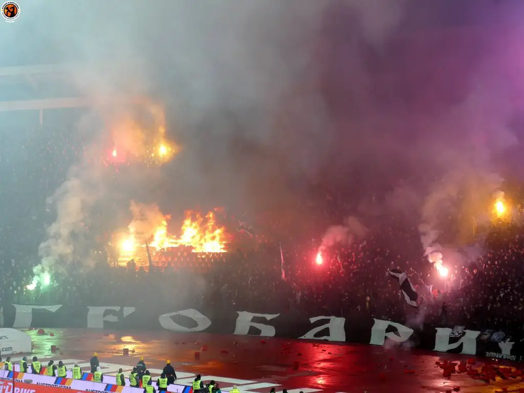 In the section where Partizan ultras were positioned, fire broke out not from a stray flare, but from deliberate ignition of seats and material in the stand. Flames shot up, thick smoke filled the air, and the referee had no choice but to pause the match as firefighters sprinted onto the pitch to put it out.